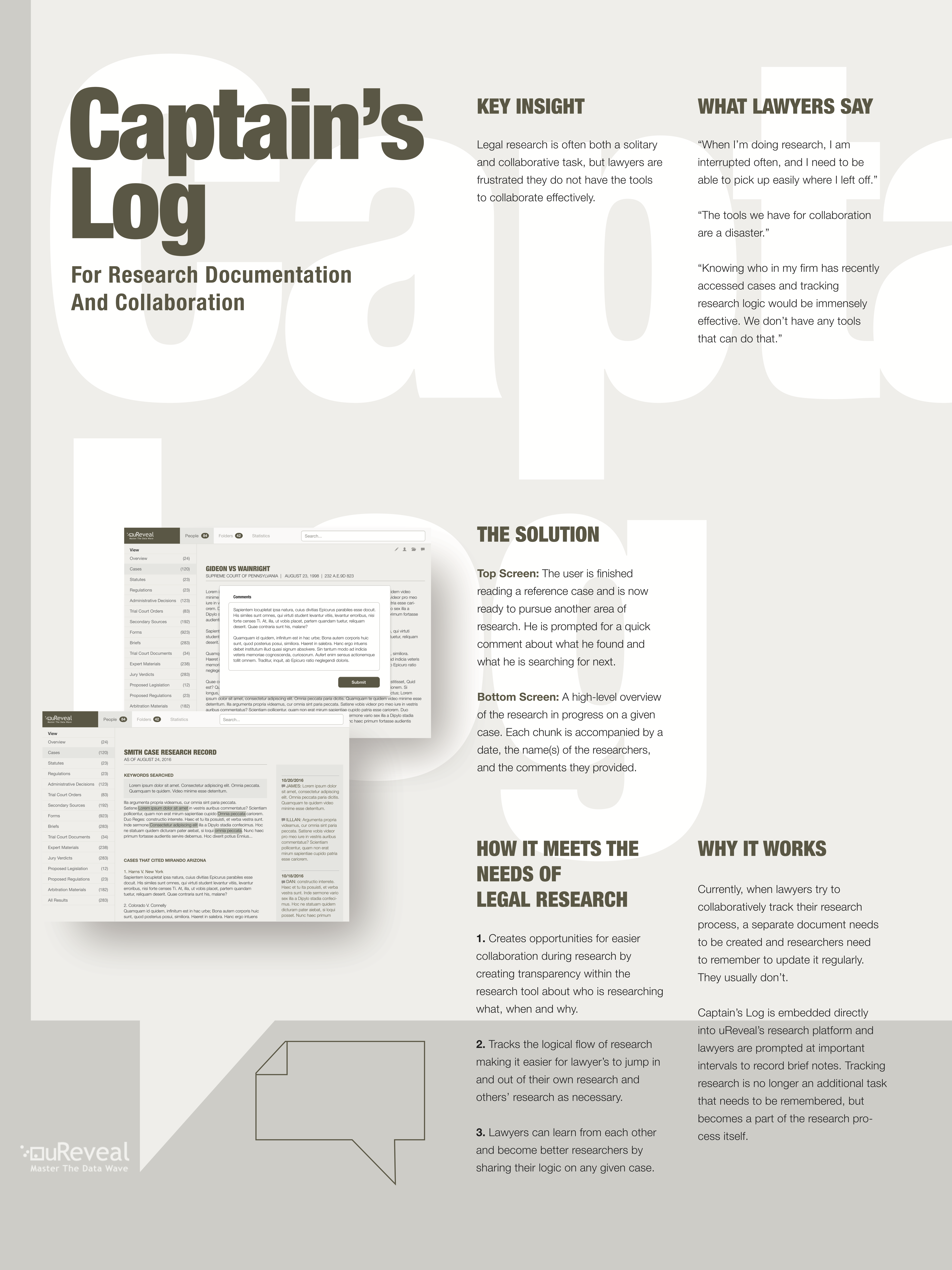 We had the opportunity to pitch Captain's Log in a poster presentation to a client who is trying to expand the user base of their research platform to include lawyers.