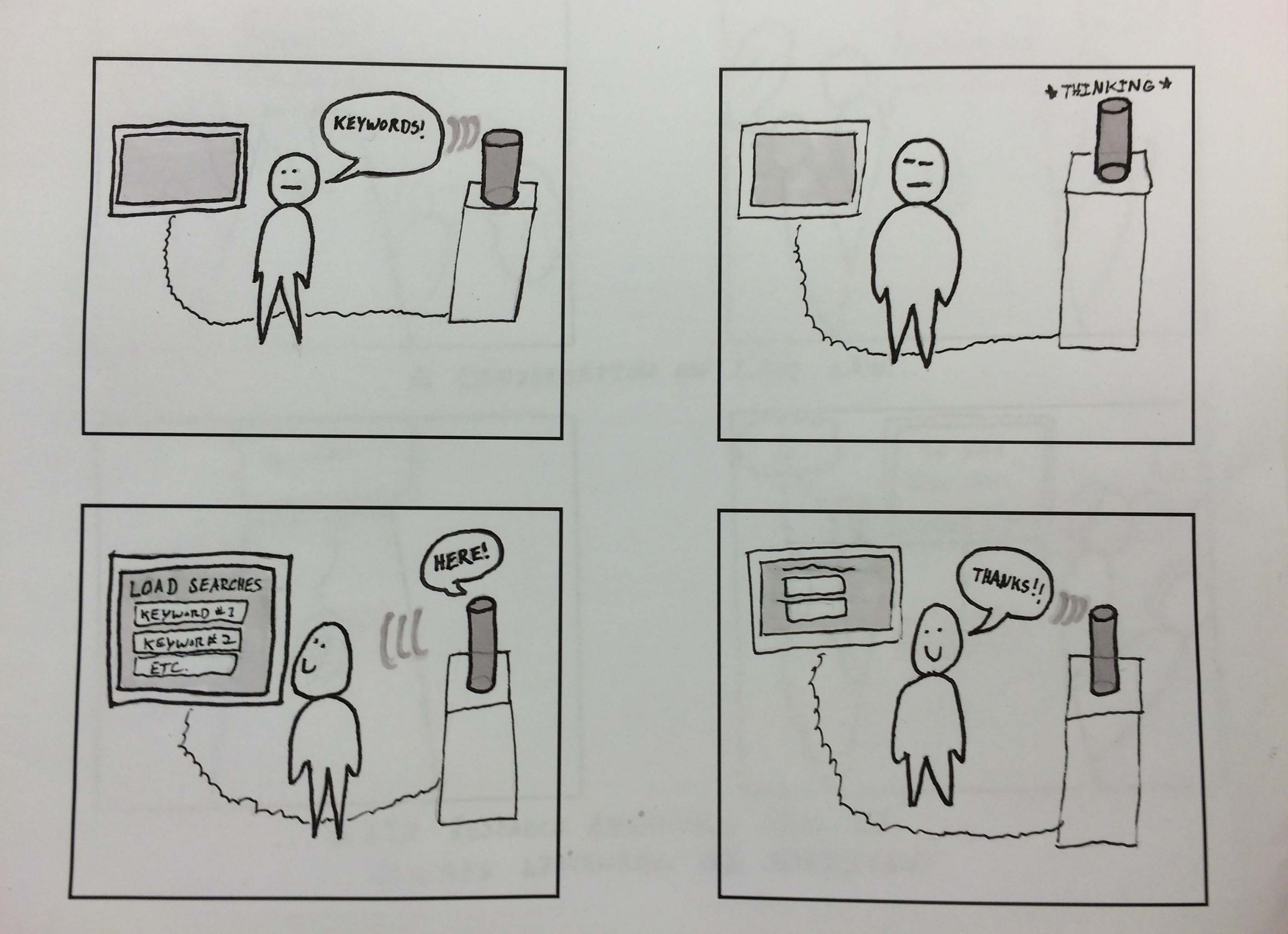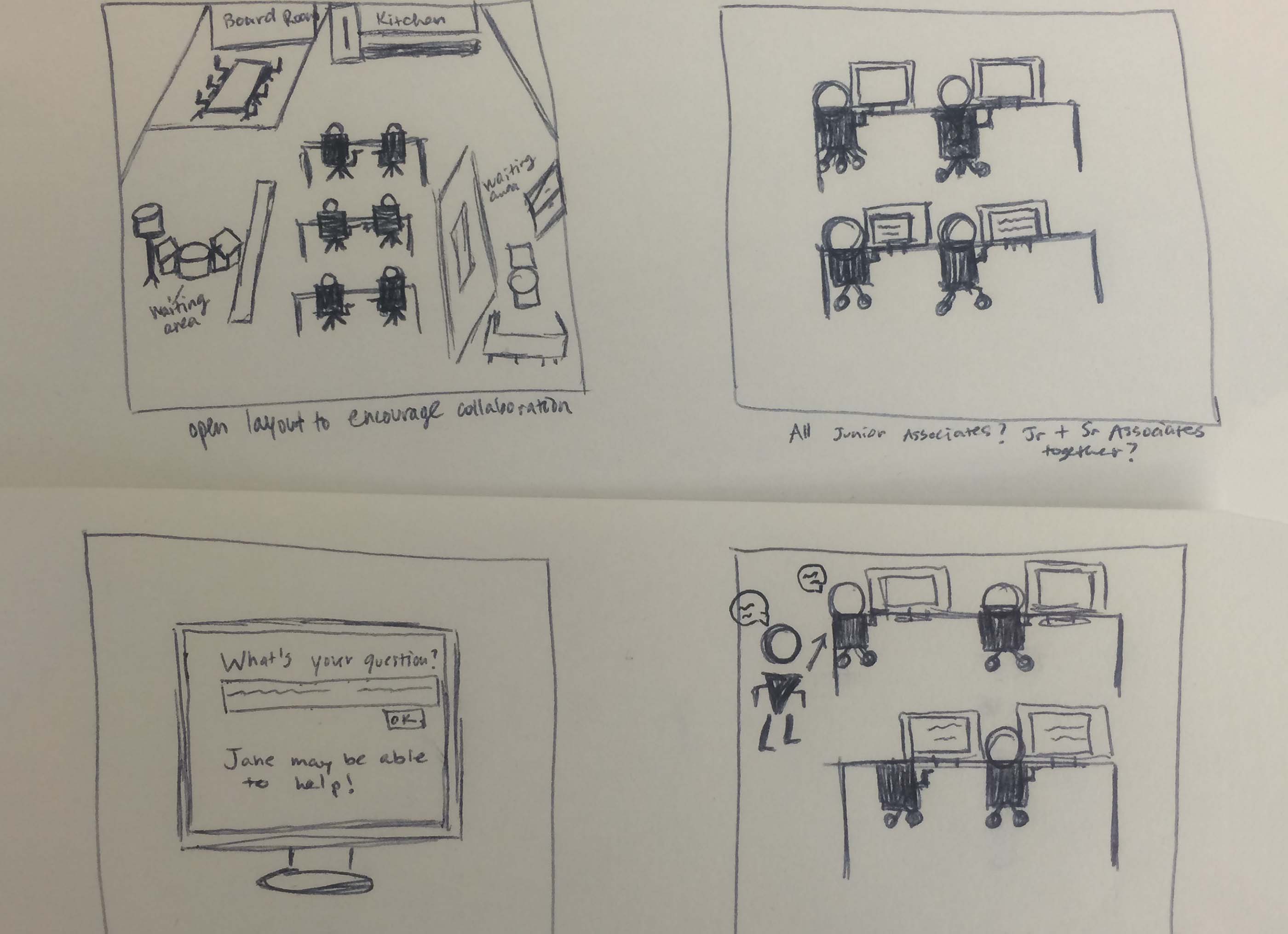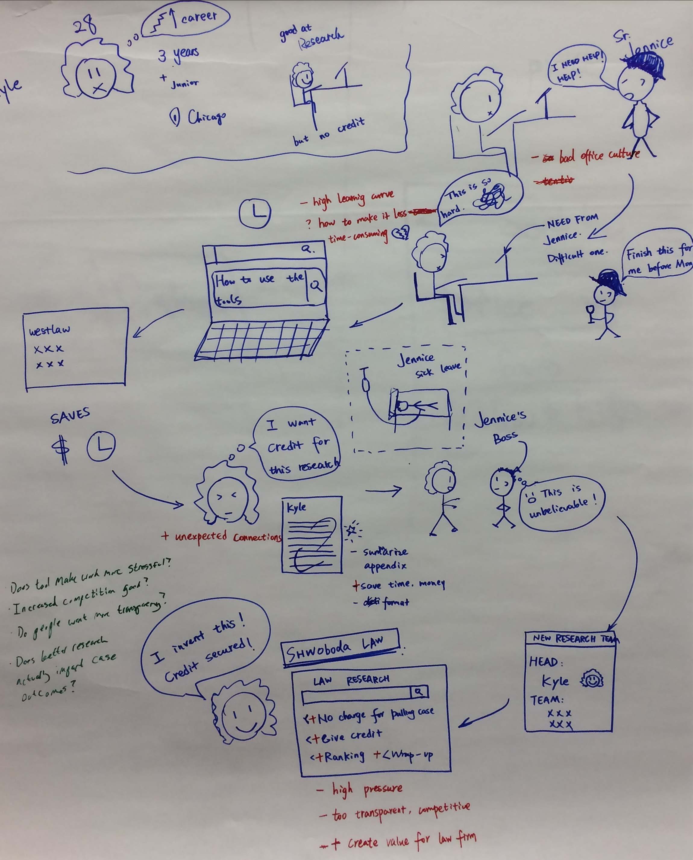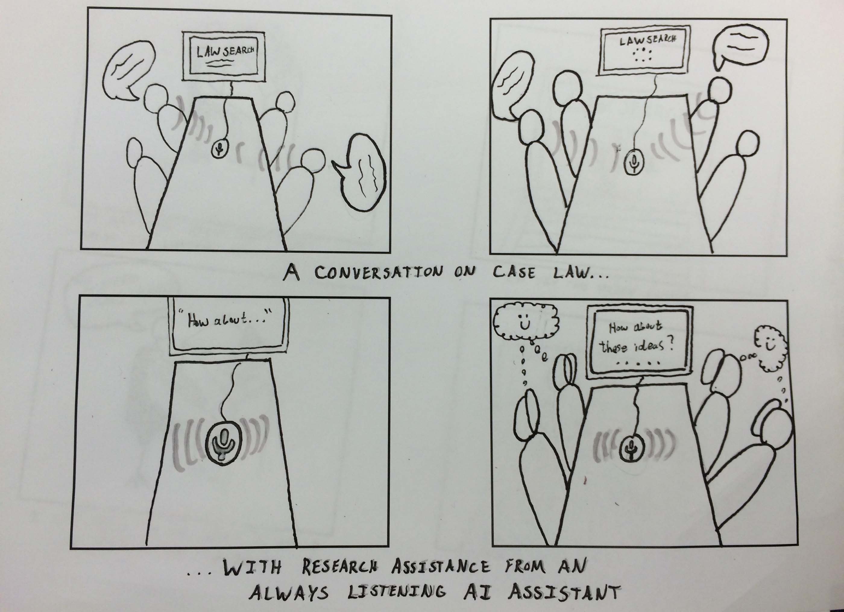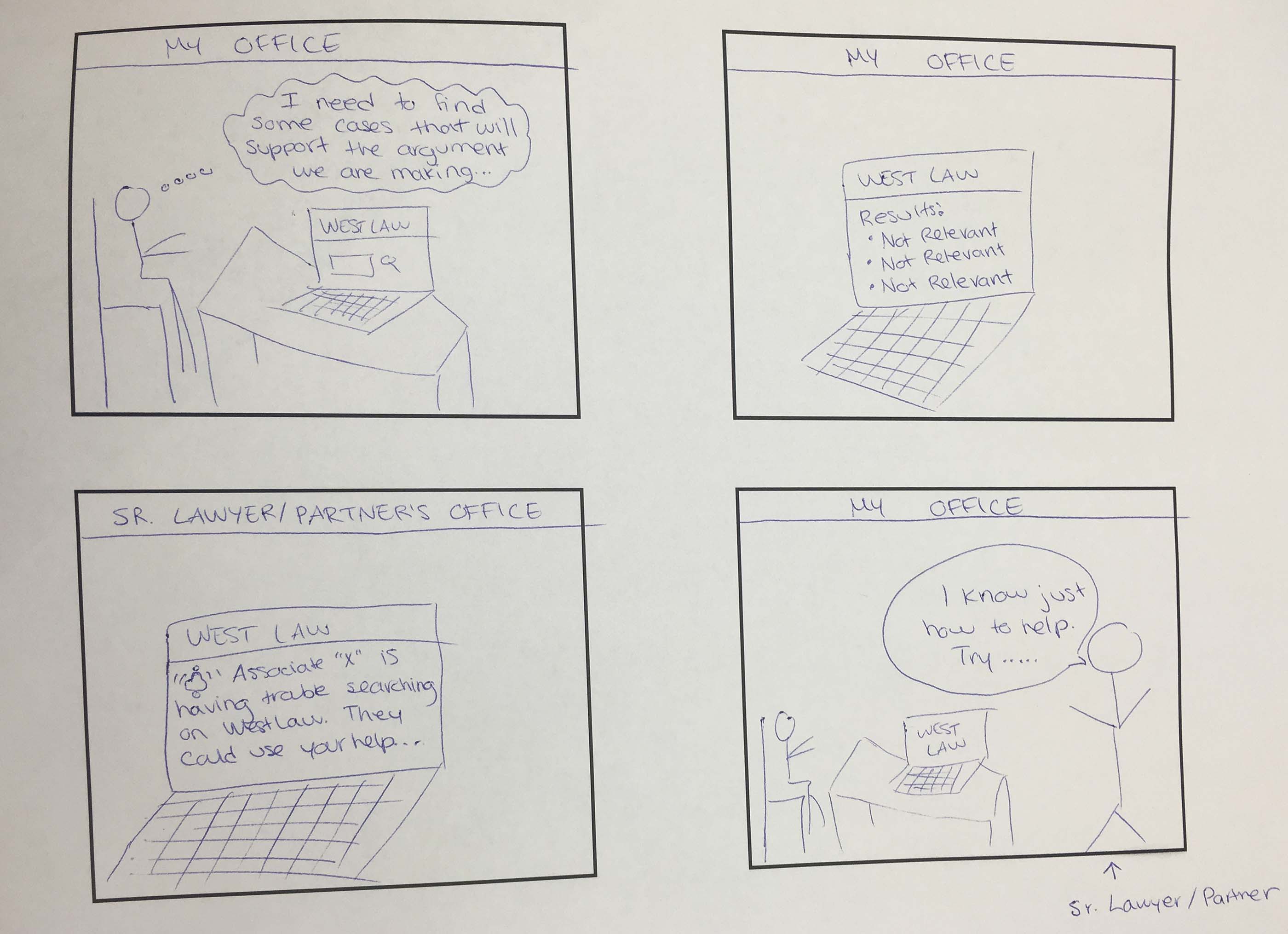 Using the design ideas we generated through visioning, we created 15 concept storyboards. We shared them with three junior lawyers, who do research frquently as part of their job. We reviewed each storyboard for ~1 minute to get their unfiltered reaction to the concept. Most of the reactions were lukewarm, but all three lawyers reacted excitedly to one of the storyboards representing a collaboration tool built into their research tool.
