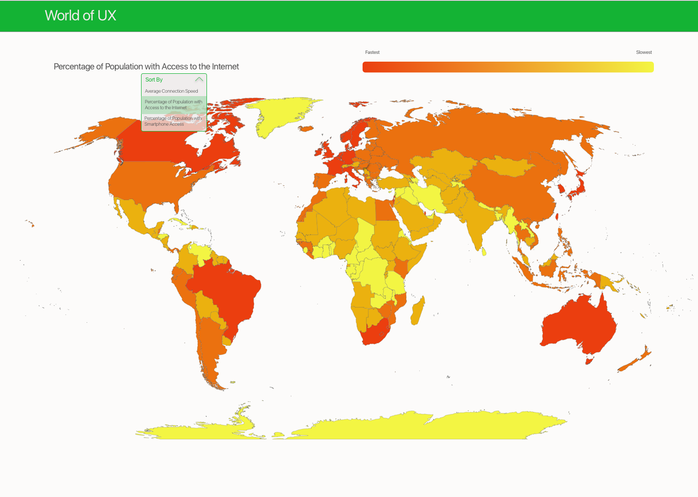 To build the fully interactive prototype, I used leaflet.js, a javascript library for geographic data visualizations, formatted public data from trusted sources into a geoJSON file, and assigned each metric a color gradient to display each country's values. I implemented a tab navigation structure instead of a dropdown menu to make it easier for the users to see which datasets are available from any screen.